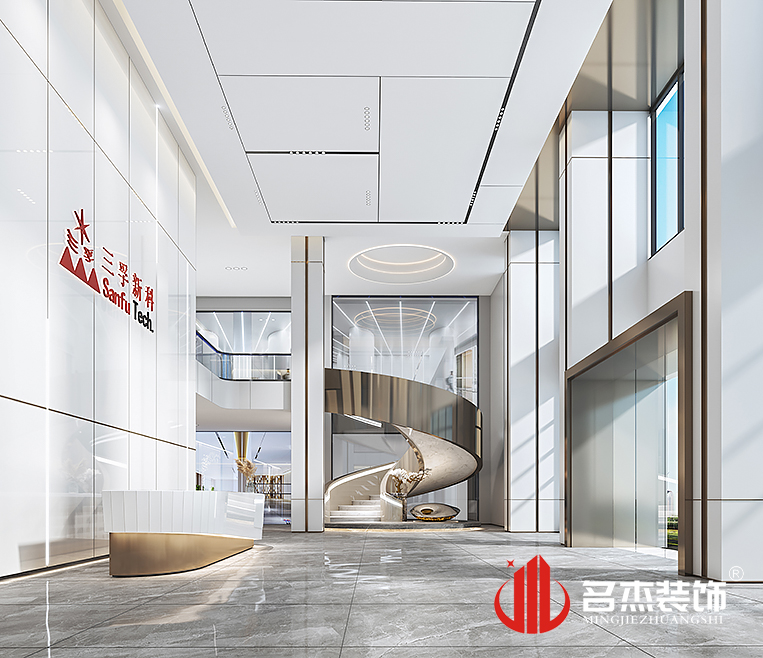 整體辦公室裝修設計當中加入了很多不同的造型,讓空間變得更加有設計感。展廳區域則使用弧形吊頂造型,讓流動路線跟著弧線走,起著一個引導的作用,有著更深的沉浸感。螺旋式樓梯因其流線造型美觀,且有著典雅的氣息,深受客戶的喜愛。休閑區域則使用較為傳統的樣式,綠植,鵝卵石鋪墊的過道,空間中無處不透露著中式典雅的風格。
