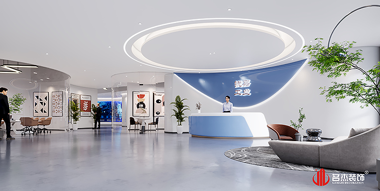 整個辦公室裝修設計空間是傳統的黑白灰作為設計主調,加入企業的logo色——科技藍,體現出空間的科技感的同時,還能夠增加空間的設計感。前臺背景墻的月牙和天花的圓頂相互呼應,形成一種對沖但又和諧的元素,也為空間增添了不少的設計感。