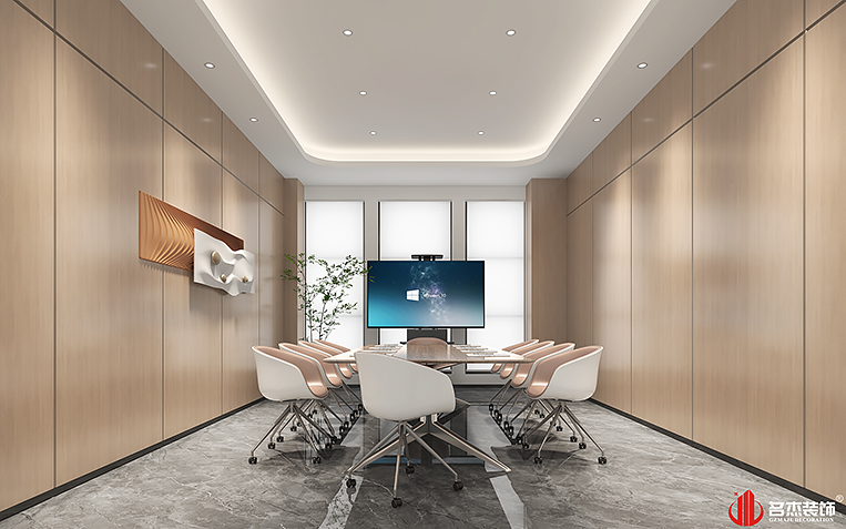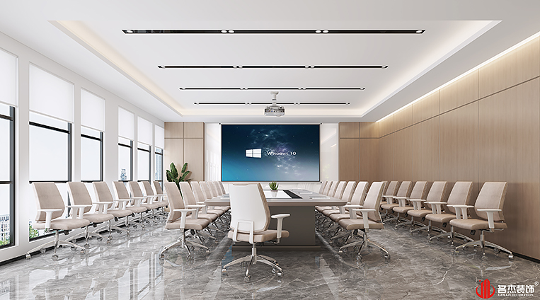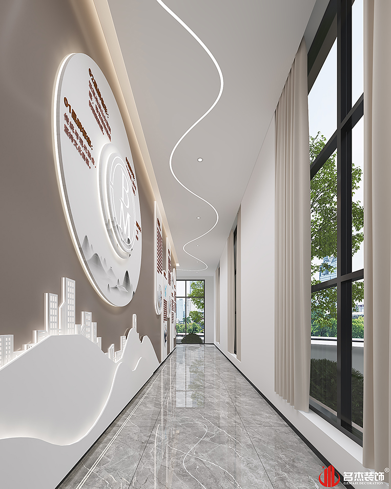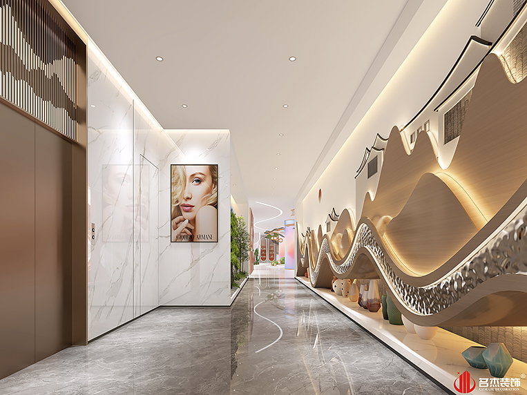 辦公裝修設計空間的主打風格是時尚簡約風格,但是設計團隊從化妝品行業中汲取設計靈感,同時加入一些線條的元素,堆疊出一種不同往常的時尚簡約風格。前臺區域則是使用簡單的線條,搭配圓弧的天花吊頂,天圓地方的設計概念,簡約而不簡單。而在電梯間這個地方,利用水紋不銹鋼的材料,結合弧線元素,具象化了中國龍這個設計元素。太陽,中式房屋,中國龍,寓意著江西瑞彩化妝品公司能夠龍騰四海。#廣州辦公室裝修#