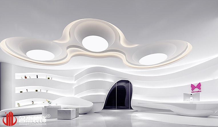 考慮到展廳為主,所以使用大量的弧線來作為整個辦公室裝修風格的主要元素,利用線條和弧線來打造一種流線美的美學,與企業的核心業務美容做一個呼應。