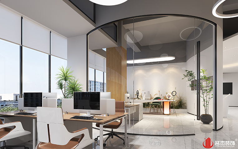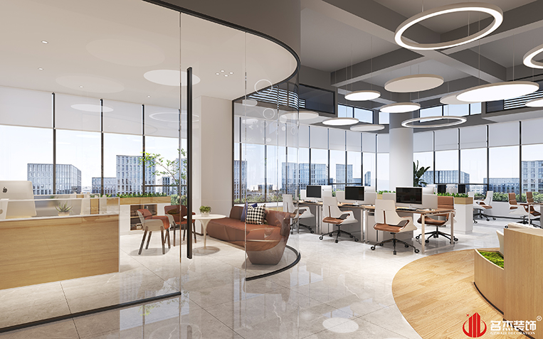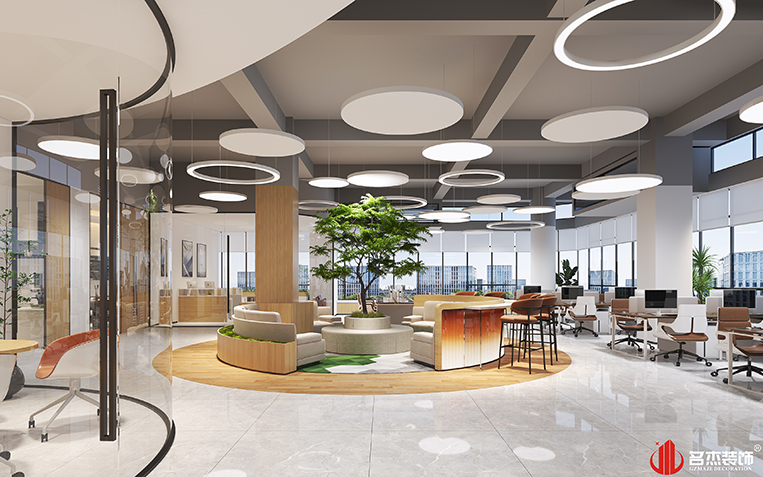 整體風格是按照時尚簡約風格來設計的,但是在這里面加入了原木的一些元素,讓整個空間有著清新自然的氛圍,同時圓弧動線的加入也讓空間的整體觀感得到一個很大的提升。特別是在休閑區這一個區域,能夠很好的將休閑的元素發揮出來,在這個空間中顯得尤為突出。在天花區域,設計團隊采用的是工業風來打造,但在這個空間加入圓形吊燈和圓形的裝飾物,讓天花區域看起來更加有特色。#廣州辦公室裝修設計#